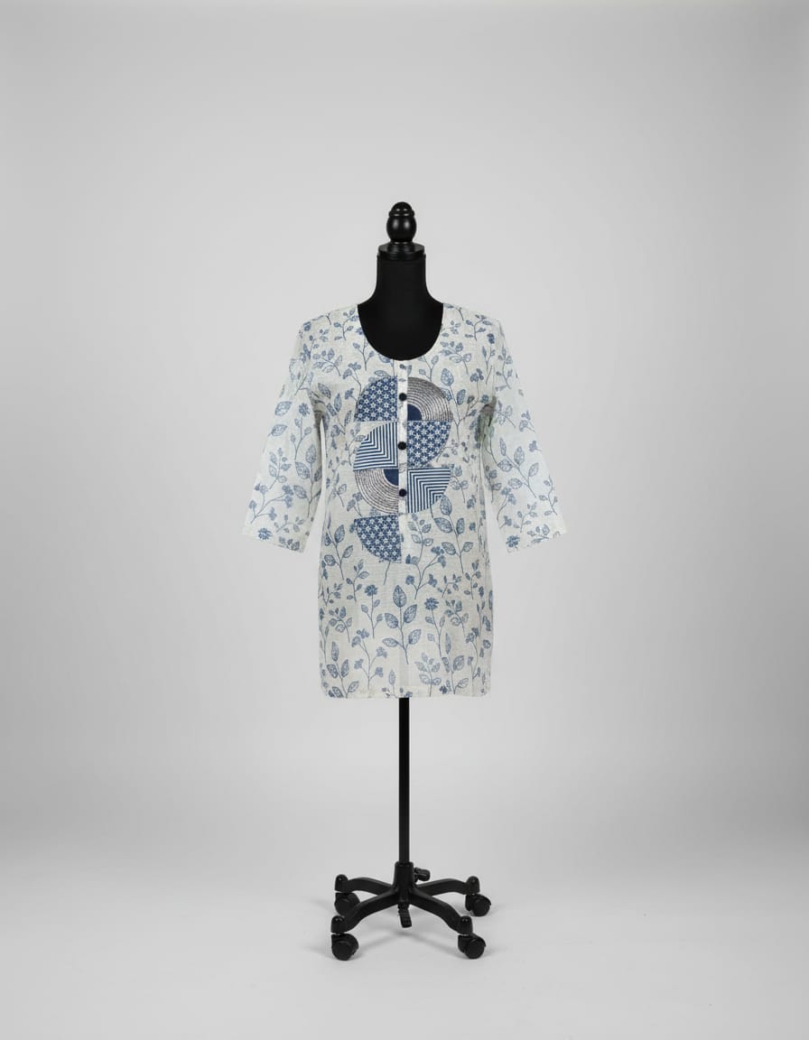 Made from soft, breathable cotton, this blouse features an elegant semi-circle appliqué design at the front, enhanced with subtle contrast patchwork detailing. The round neckline with button placket lends a classic touch, while three-quarter sleeves ensure all-day comfort and easy styling. Designed with lining in the body for added comfort and coverage, this blouse pairs effortlessly with jeans, trousers, or leggings—perfect for casual outings, workdays, or weekend wear.