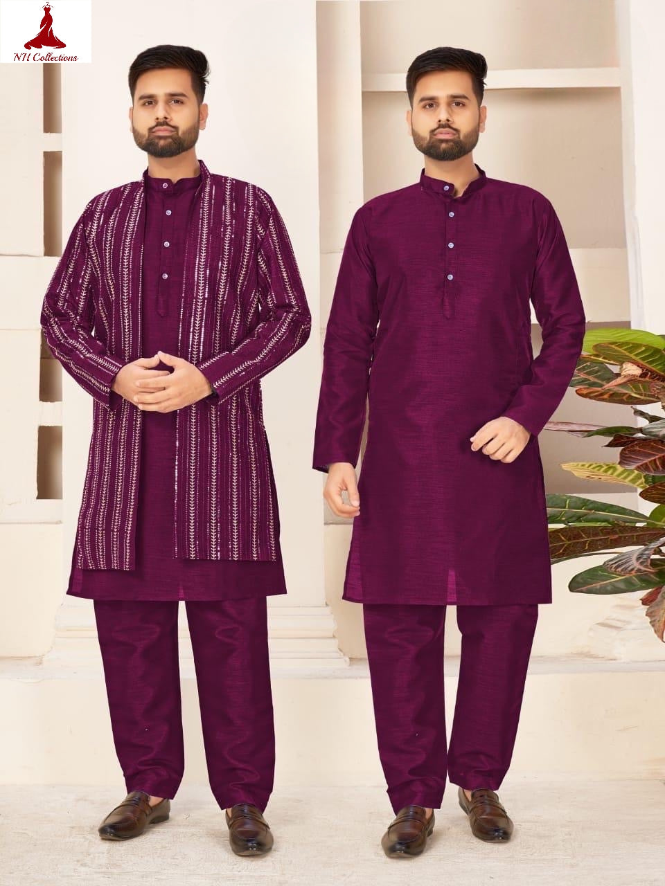 Kurta and pants set in banglori silk paired with a full-length jacket adorned with golden thread and sequins work will make a statement. Can be worn without jacket too.